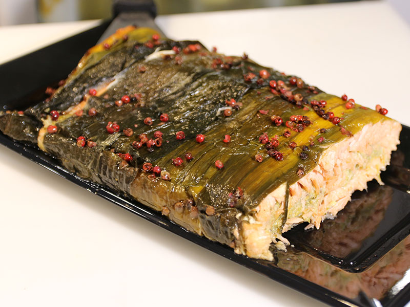 A rich and flavorful main course, made with salmon fillets stuffed with a tasty filling of pistachios, leek, celery, and bread, seasoned with extra virgin olive oil, salt, and pepper.